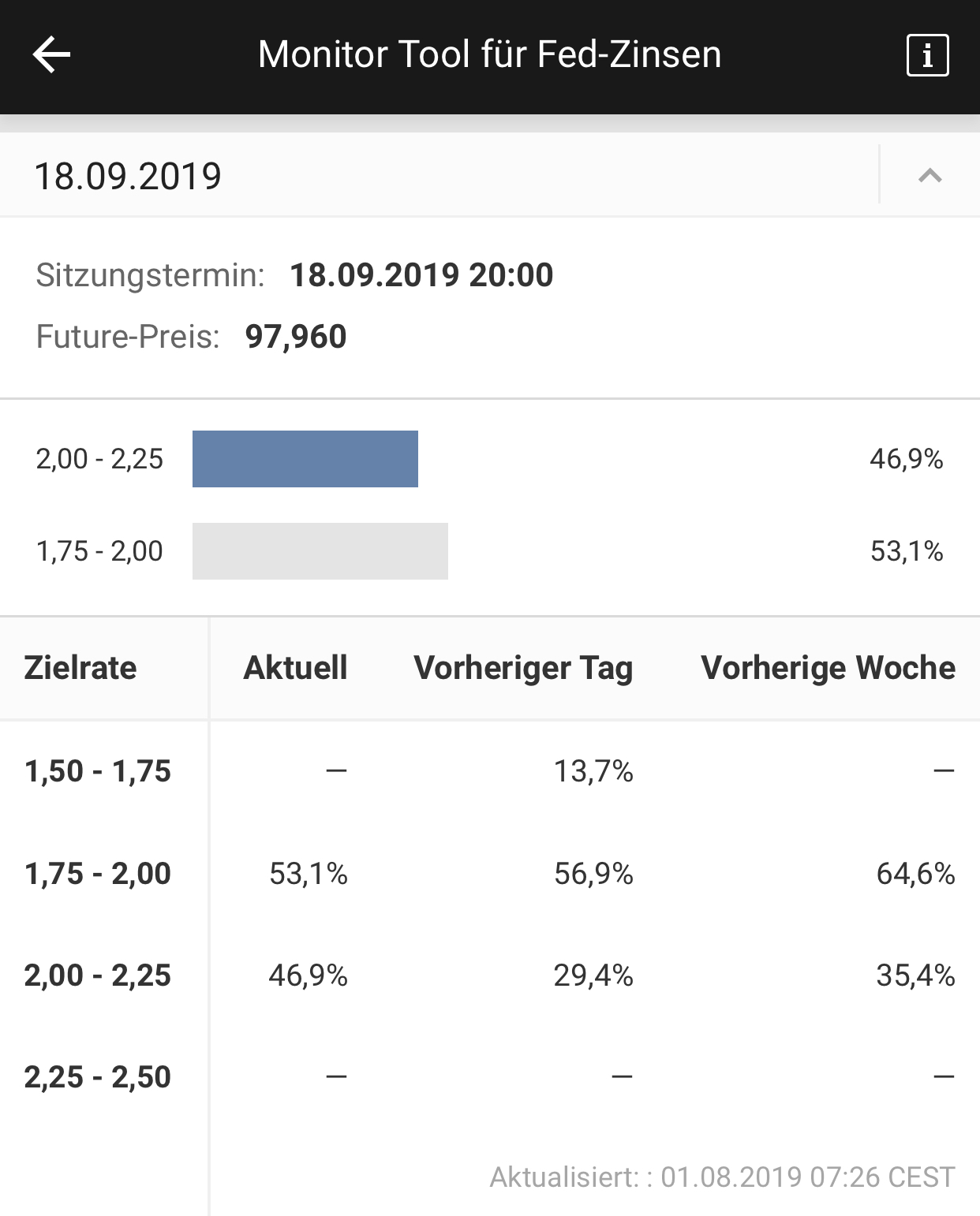 Abzulesen ist dies am FED Future. Der Markt geht heute von 46,9 % Wahrscheinlichkeit aus, dass im September keine weiteren Zinsen gesenkt werden. Gestern ging der Markt noch von 29,4 % aus.