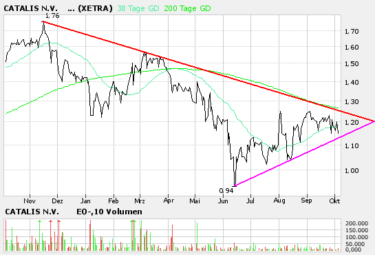 Derzeit befindet sich Catalis nämlich noch klar im mittelfristigen Abwärtstrend, der zusammen mit der 200TageLinie in diesem bereich bei 1,27-1,28 liegt. Außerdem war dort das Hoch des letzten Anstiegs.
