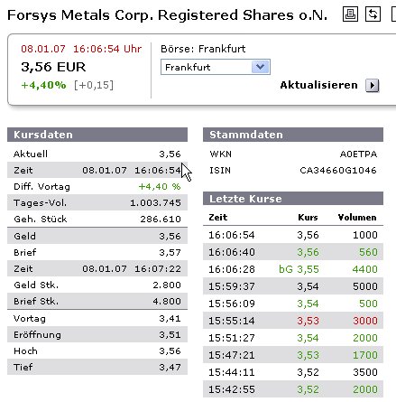 Toronto, Ontario, Kanada. 3. Januar 2007. Forsys Metals Corp. (Frankfurt WKN: A0ETPA, TSX.V: FSY) gibt bekannt, dass es einen Vertrag mit Salman Partners Inc. eingegangen ist, wonach Salman als Führer eines Emissionskonsortiums eingesetzt wird. Das Konsortium besteht sonst aus Paradigm Capital Inc., Canaccord Adams, Blackmont Capital Inc. und Laurentian Bank Securities Inc. und soll die Emission von 8 Mio. Stammaktien des Unternehmens zu je 4,75 $ und von 2 Mio. Aktien im Falle einer Überzeichnung für Einnahmen von bis zu 47,5 Mio. $ durchführen.
