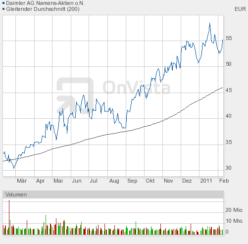 Daimler sehe ich wie schon x-mal in diesem Thread gehört kurz-mittelfristig um die 60 herum. Dann ist die Frage, wie man sich dort hält. Ob es dann wieder starke Gewinnmitnahmen gibt und man wieder runtergeht, oder ob man sich dann dort erstmal einnisten kann, um dann danach höhere Regionen anzugreifen.