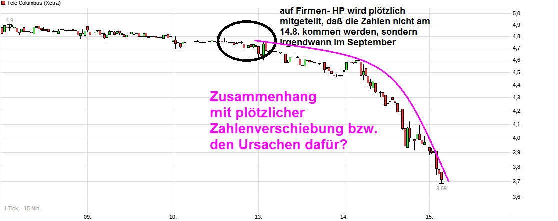 Also ich bekomme langsam den Eindruck, daß die plötzliche Verschiebung der für gestern vorgesehenen Zahlen in den September eine Ursache hat, die offenbar unangenehme Gründe hat und man noch nicht bereit ist die vollständig und ehrlich allen Marktteilnehmern zu offenbaren. Wieso sonst diese plötzliche radikale Beschleunigung beim Kurs nach unten seit Ende letzter Woche die Verschiebung kurzfristig auf den Plan kam?