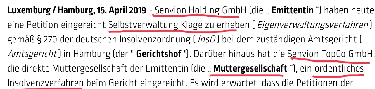 "Additionally, Senvion TopCo GmbH, the Issuer’s direct parent company, filed a petition for ordinary insolvency proceedings with the Court"