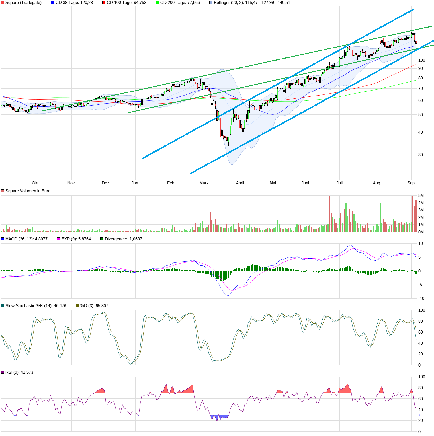 Weiter negativ: Der Trend seit März ist durchstochen, der MACD hat ein Verkaufssignal geliefert. Wir sind inzwischen in einer Situation, wo Erholungen eher verkauft werden. Deshalb Vorsicht bei Nachkäufen.