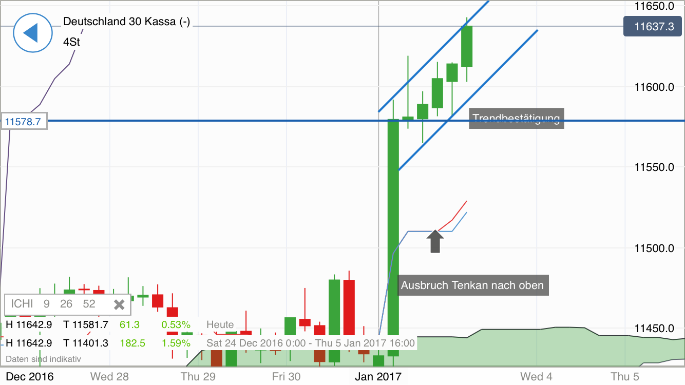 Wieder der 240er ichimoku. Trendbestätigung bleibt. Grüne Kerzen im Vormarsch und noch Ausbruch der tenkanlinie, die bei kleinen rücksetzer unterstützend wirkt. Somit sind Ziele bis 676 heute möglich. Sollten wir ein "echtes Gap" erleben, also Anfangsunterricht über gestriges TH, dann bis zu 90%ige Wahrscheinlichkeit der gapaufüllung gegeben. Somit rücksetzer bis 575 einplanen. Long bleibt weiterhin on. Hier Chart