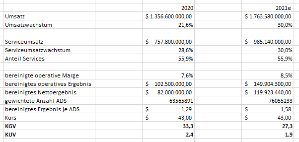 Non-GAAP operative Marge: "Nur" 10% gehen wohl in Ordnung? Letztendlich hat man aufs Gesamtjahr mit 7,6% genau das erreicht was man in den Calls zu Q4 2019 und Q1 2020 für 2020 angekündigt hat, nämlich die Mitte zwischen 7 und 8 Prozent. Im Q2 2020 Call meinte der alte CFO noch dass man die Margenexpansion in 2021 auf dem Niveau weiterführen könne, sodass ich mal mit 1% Steigerung dieses Jahr rechnen würde. Allein Q1 dürfte jetzt relativ gesehen ein enormer Sprung werden weil man dort letztes Jahr fast nichts verdient hat durch Covid.