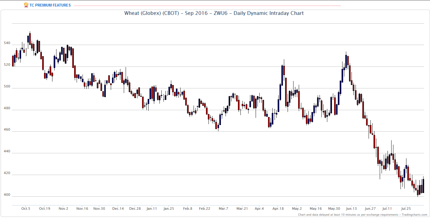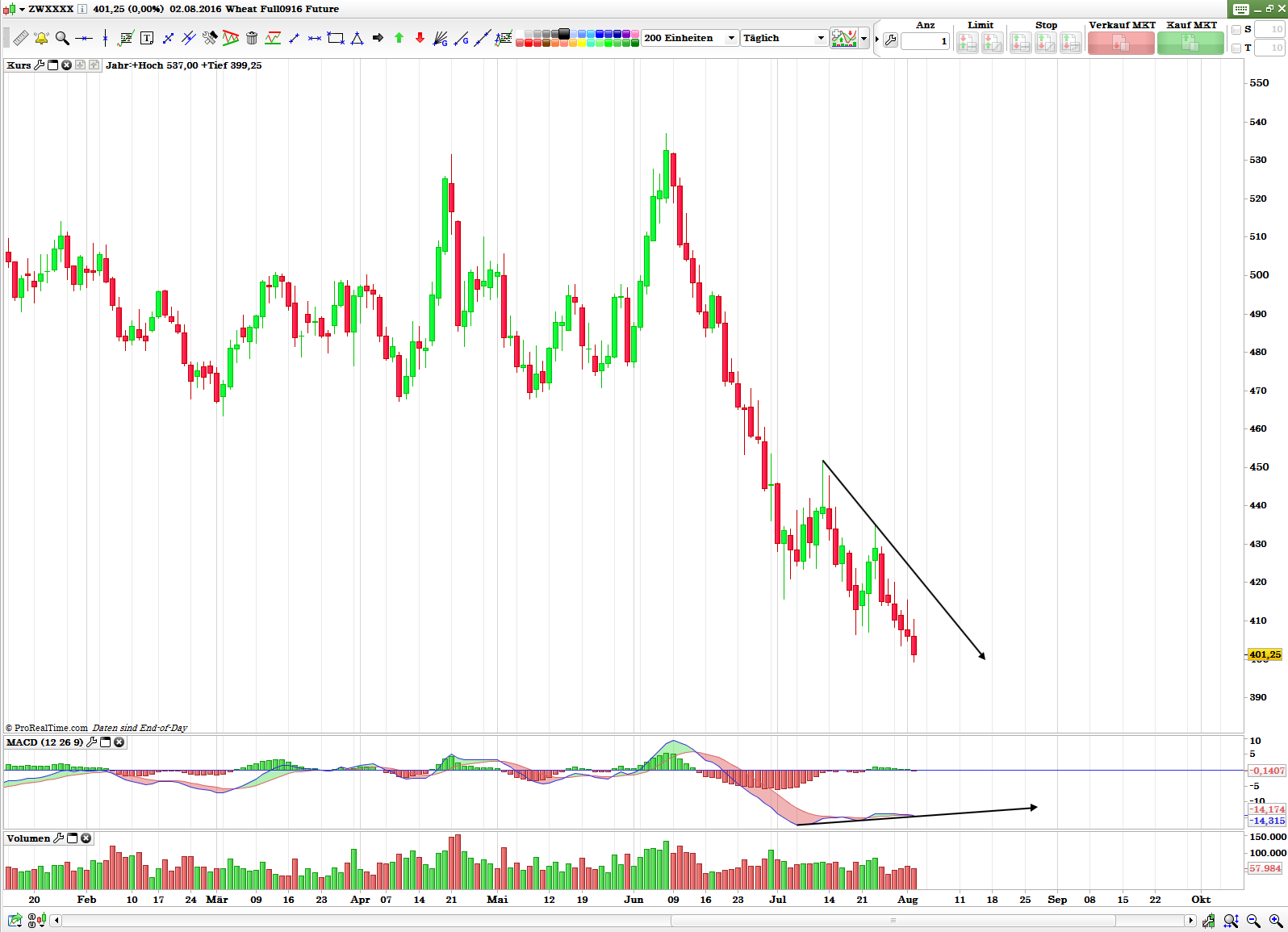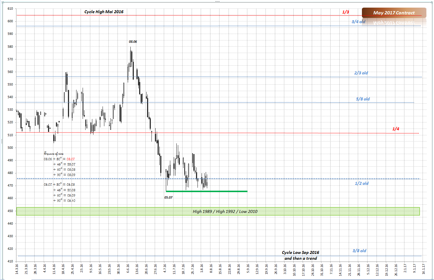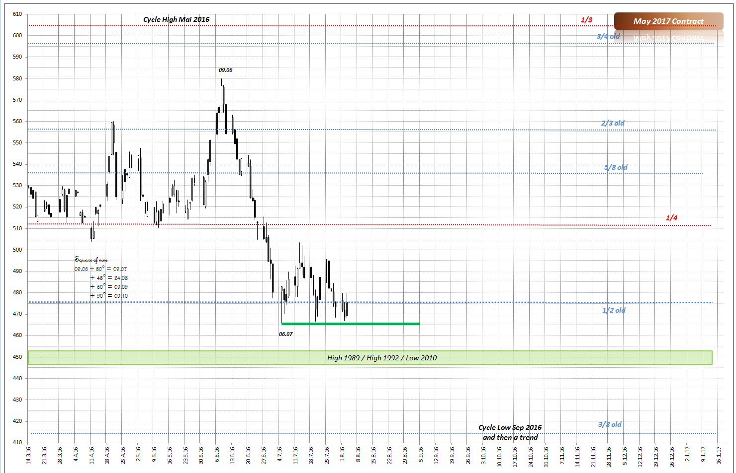 Eine Erhollung schätze ich bis 540, max 560 us cent (Mai 2017 Kontrakt). So lange das Hoch vom 09.06 als Widerstand hällt, rechne ich mit einem Zyklustief in September, spätenstens Oktober 2016. Wie Tief? Kann ich noch nicht genau sagen, aber bis auf jetzige Tiefs müsste Weizenpreis zurückkommen.