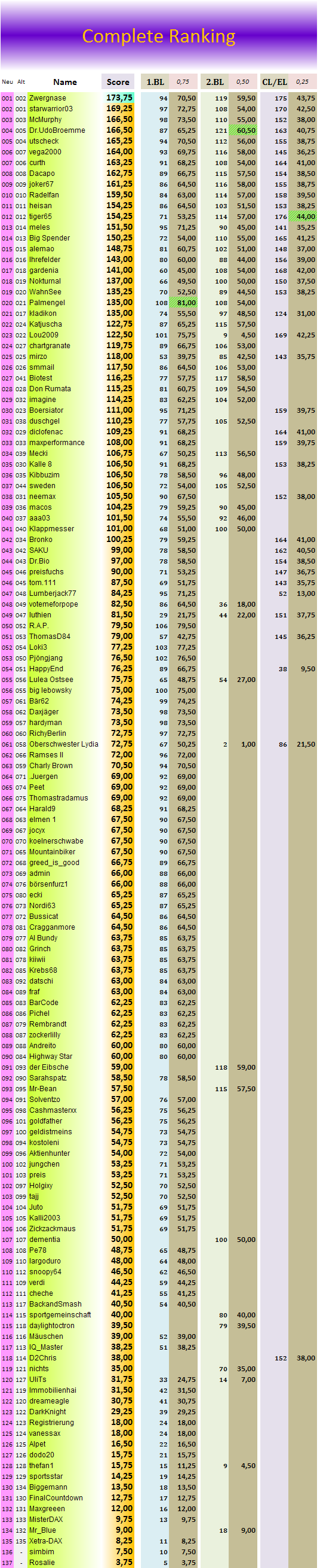 CL/EL hab ich runtergefahren, weil - nach meinen Berchnungen sind dort zw 500-575Pkt möglich bis zum Schluß.. Das höher gewichtet würde die Wertung verfälschen.. Denn wie gesagt - die meisten sind in der 1.BL zusammen.. Und darauf liegt ja auch das Hauptaugenmerk..
