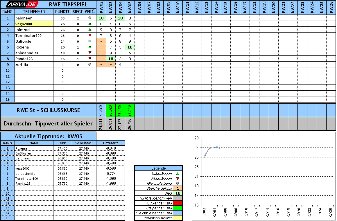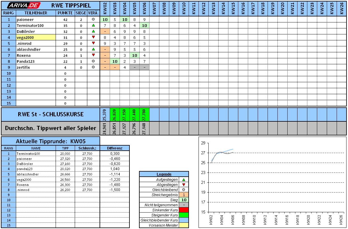 RWE hat am Freitag wieder einen grünen SK hinterlassen, was nun bedeutet, dass wir im Grunde schon die 4te Woche hintereinander grün sind. Terminator konnte seinen ersten Saisonsieg verbuchen und drückt sich somit auf Platz 2 nach vorne.