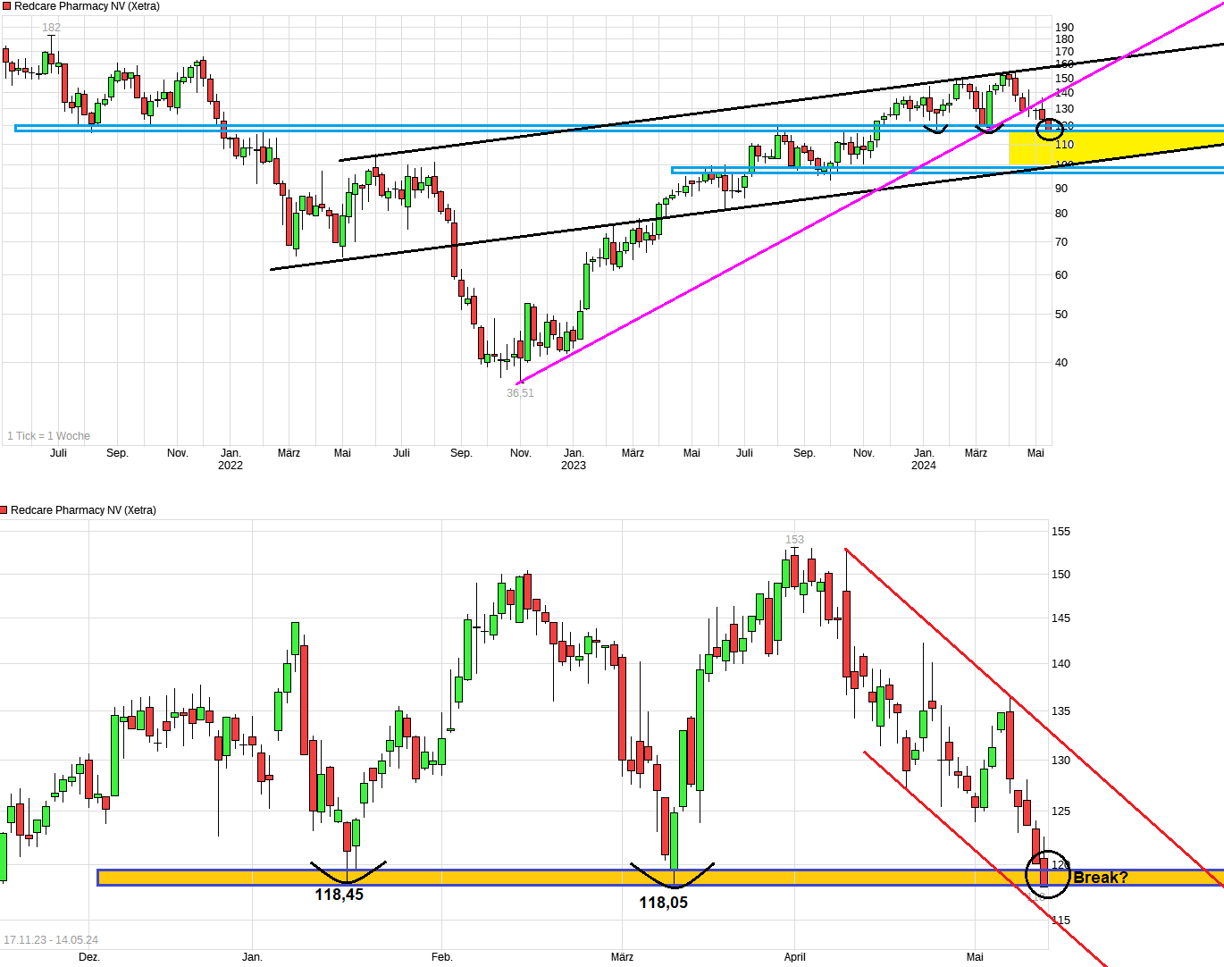 " Aus technischer Sicht droht jetzt eine Beschleunigung des Abwärtstrends. Gibt es nicht zeitnah eine tschnische Gegenbewegung, dürfte der Unterstützungsbereich um 110 Euro in den Fokus rücken. Sollte auch diese Marke nachhaltig unterschritten werden, könnte Redcare sogar wieder in den Bereich von 100 Euro fallen. "