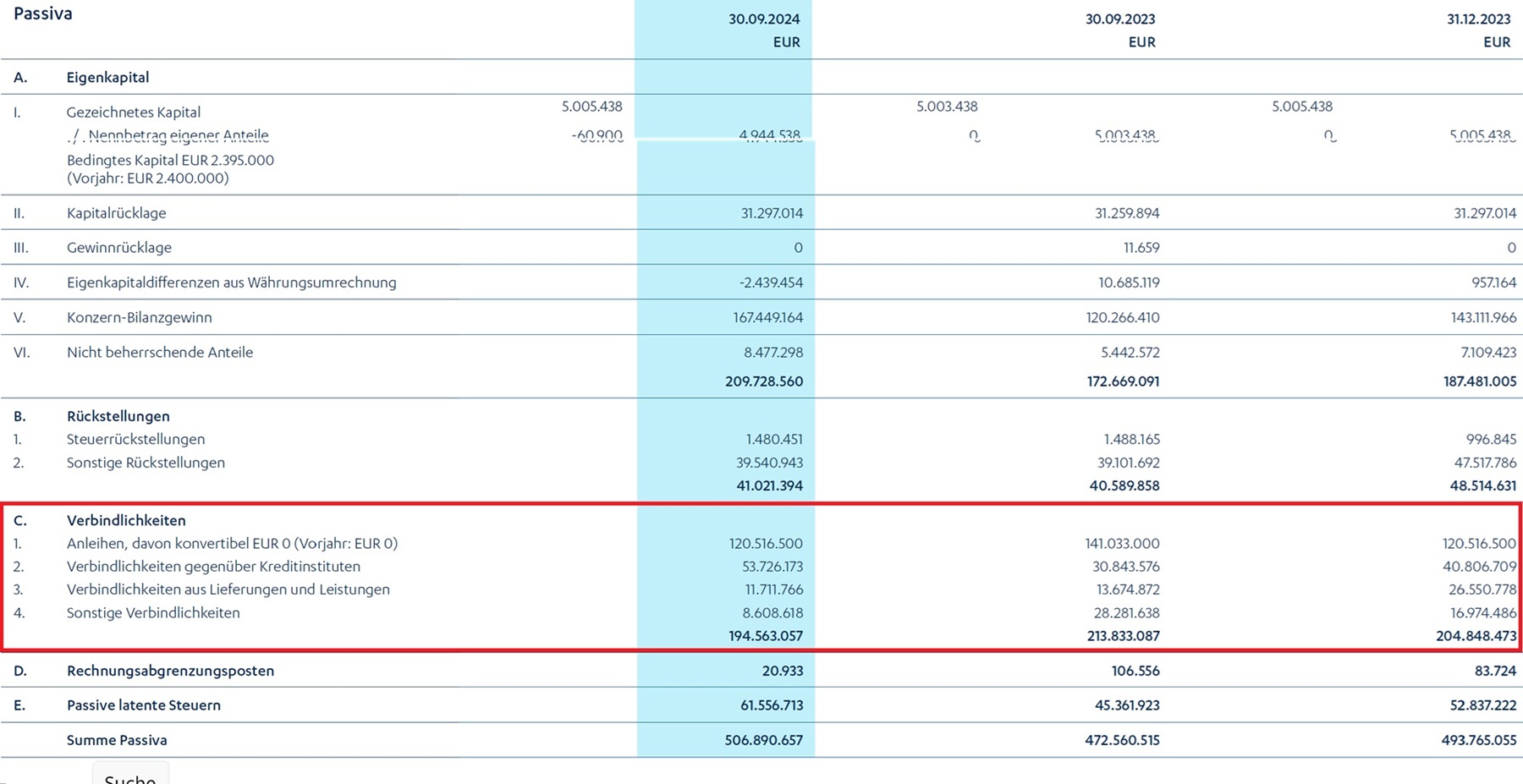 Das Eigenkapital des Konzerns ist zum 30. September auf 209,7 Mio. EUR gestiegen (30.09.23: 172,7 Mio. EUR). Die Eigenkapitalquote belief sich Ende September auf 41,4% (vor einem Jahr: 36,5%) und steigt nach Rückführung der Anleihe auf über 43%.