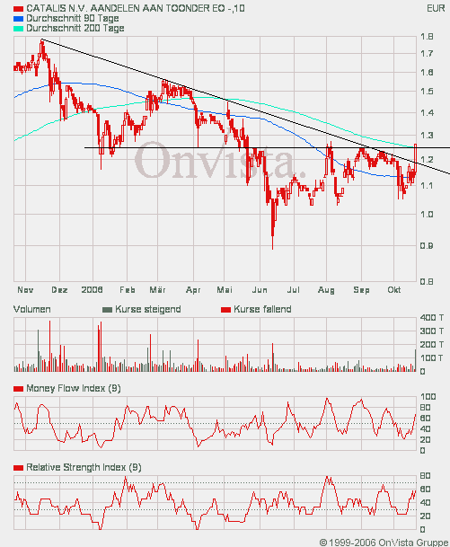 Da auch 2007 noch keine signifikanten Steuerzahlungen abzuziehen sein dürften, sollte das Ergebnis je Aktie mindestens die Marke von 0,17 Euro erreichen. Beim aktuellen Kurs von 1,18 Euro beträgt das Kurs-Gewinn-Verhältnis demnach knapp sieben. Unter diesem Gesichtspunkt zählt Catalis zu den günstigsten Werten auf dem heimischen Kurszettel. Allerdings: Dazu gehörte Catalis auch schon vor der Bekanntgabe des neuen Zahlenwerks. Dennoch lassen wir den Wert auf der Hot-Stock-Liste und veranschlagen das Kursziel auf zunächst 1,50 Euro.