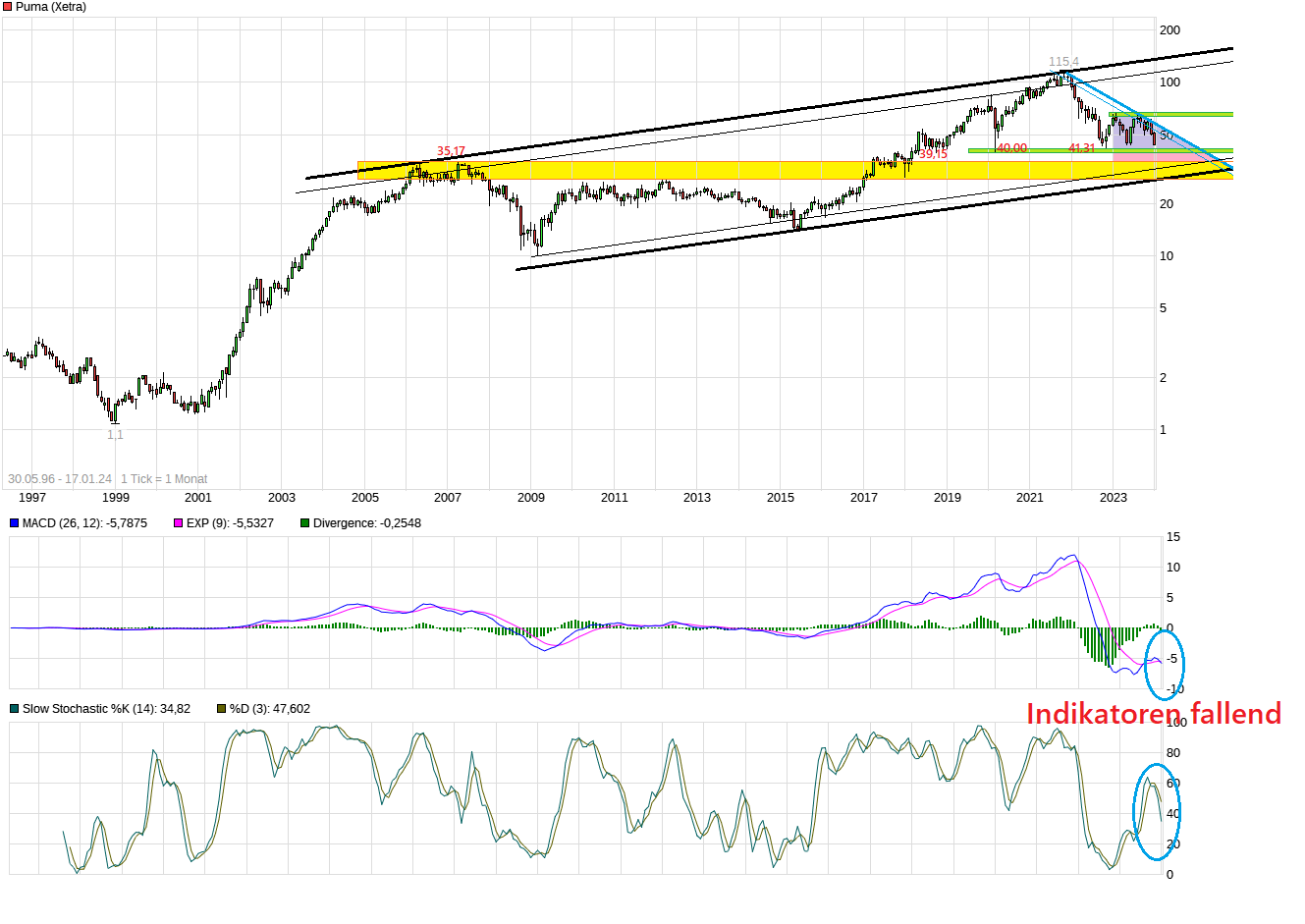 Es wird ja die letzten Wochen schon sehr viel eingepreist, da man eben die negativen Aussagen von Konkurrenten schon kennt. Allerdings kommt es auch darauf an was parallel alles noch vor den Zahlen passiert, d.h. was die Gesamtstimmung an der Börse macht und ob direkte Konkurrenten noch weitere neue negative Aussagen machen, die auch auf die nähere Zukunft ausgerichtet sind. Von einer sehr langfristigen Betrachtung aus wäre dann auch denkbar weiter noch zu korrigieren bis zur Unterseite des schwarzen Trendkanals, den ich unten im Monatskerzen-Chart eingezeichnet habe, in dem die Indikatoren weiter fallend sind. Allerdings müßte man in so einem ungünstigen Fall da nicht gleich wie ein Stein runterfallen bis zu der Linie, sondern es könnte auch eher seitwärts/leicht fallend passieren oder mit kleine Zwischenerholungen.