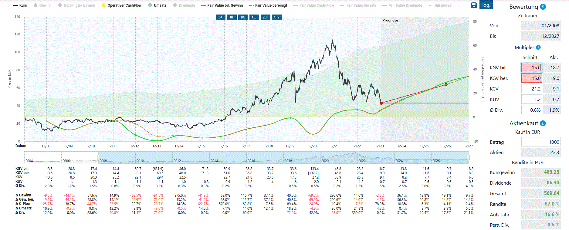 ich bin seit gestern wieder in Puma investiert (1. Tranche). Ich gehe dabei von folgenden Überlegungen aus. Aktuell hat die Aktie ein KGV von rd. 19. Wenn man die völligen Über- und Untertreibungen weglässt (2008: KGV von 10, 2021: KGV von 55), dann pendelt das KGV zwischen 18 und 30, abhängig von konjunkturellen Phasen, hin und her. In der Abbildung vom Aktienfinder habe ich ein KGV von 15 (grün bzw. braun gestrichelte Linie) auf Basis der Schätzungen (2026: Umsatz von 76 EUR je Aktie) abgebildet. Bei der eigentlich recht konservativen Schätzung würde sich für 2026 bei diesem KGV eine Rendite von 57% ergeben. Es ist mir bewusst, dass ein etwaiger Gewinneinbruch die Linie für das KGV (Ansatz bei Zyklikern) deutlich nach unten drücken könnte. Andererseits würde eine konjunkturelle Erholung nicht nur die Gewinne steigen lassen, sondern auch die zur Anwendung kommende KGVs deutlich nach oben bringen. Das ist zwar ein sehr einfacher Chancen-Risiko- Ansatz, ich habe bei dieser Aktie bis dato recht gute Erfahrungen damit gemacht. Was denkt ihr?