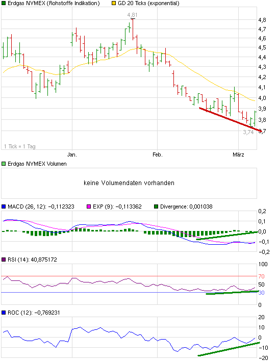 Womit wir wiederum beim MEHRVERBRAUCH angelangt wären. Diesen sehe ich (noch lange) nicht !!! Darum auch heute wieder das Desinteresse der Big Boys. Dennoch könnte sich heute eine Erholung von 2-3% auf Wochenfrist ( also bis zum nächsten Donnerstag ) abzeichnen. Dann müssten wir weiter sehen. Die Zwischenmonate März / April / Mai werden in der Regel für den Lageraufbau genutzt, um sodann für die Sommermonate gut gerüstet zu sein. Zuer Erinnerung: Es sind die Sommermonate - mit den Klimaanlagen - welche für den höheren Verbrauch verantwortlich sind. Im Winter ist der Verbrauch gegenüber den Sommermonaten nicht so hoch. Das wird immer wieder falsch intepretiert !!!