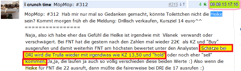 http://www.finanznachrichten.de/ausdruck/2013-08/...3-50-euro-322.htm => 09.08.2013 | 10:19 - "..Commerzbank Einstufung für Drillisch nach Zahlen "Hold" mit einem Kursziel von 13,50 Euro..... schrieb Analystin Heike Pauls in einer Studie vom Freitag. ....".
