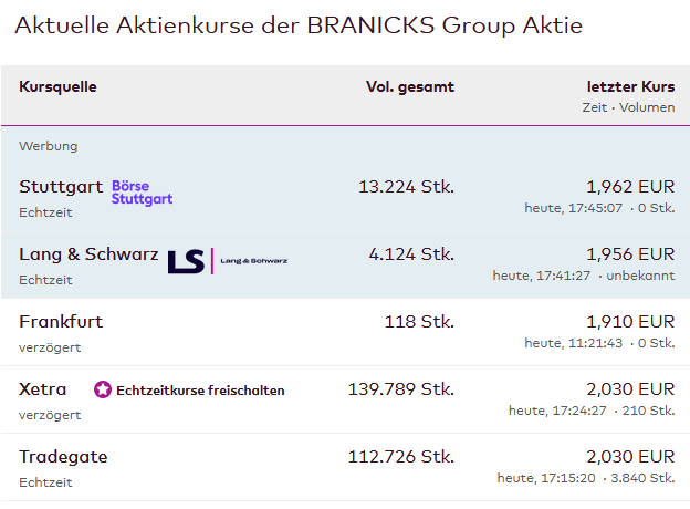 | A1X3XX | BRANICKS GROUP AG | 2,00€ | 2,08€ | 4,56% | 09:21:04 |