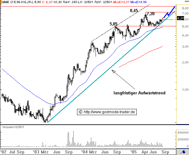 Diagnose: Die MME ME MYSELF&EYE ENTERTAINMENT AG (MME) Aktie bildete Ende Januar 2001 ihr AllTimeHigh bei 8,45 Euro aus. Danach brach sie massiv auf ein Tief bei 0,43 Euro ein. Im Februar und März 2003 stoppte die Aktie dort mehrmals. Dieser Boden war Ausgangpunkt einer fulminanten Rallye. Diese führte die Aktie bisher auf ein Hoch bei 7,20 Euro. Dieses Hoch erreichte die Aktie in der ersten Aprilwoche. Von dort aus ging die Aktie in einer Konsolidierung über, welche sie auf das Vorgängerhoch bei 5,05 zurückführte. Diese Konsolidierung führte zu einer Abflachung des langfristigen Aufwärtstrends. Zu Beginn dieser Woche überwindet die Aktie den leichten Widerstand bei 5,98 Euro.