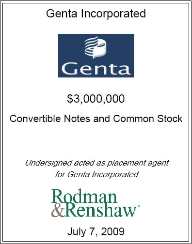 Genta has reported a net loss of $54.15 million, or $1.24 per share, for the first half of 2009, compared to a net loss of $748.02 million, or $1,060.69 per share, for the same period of 2008.