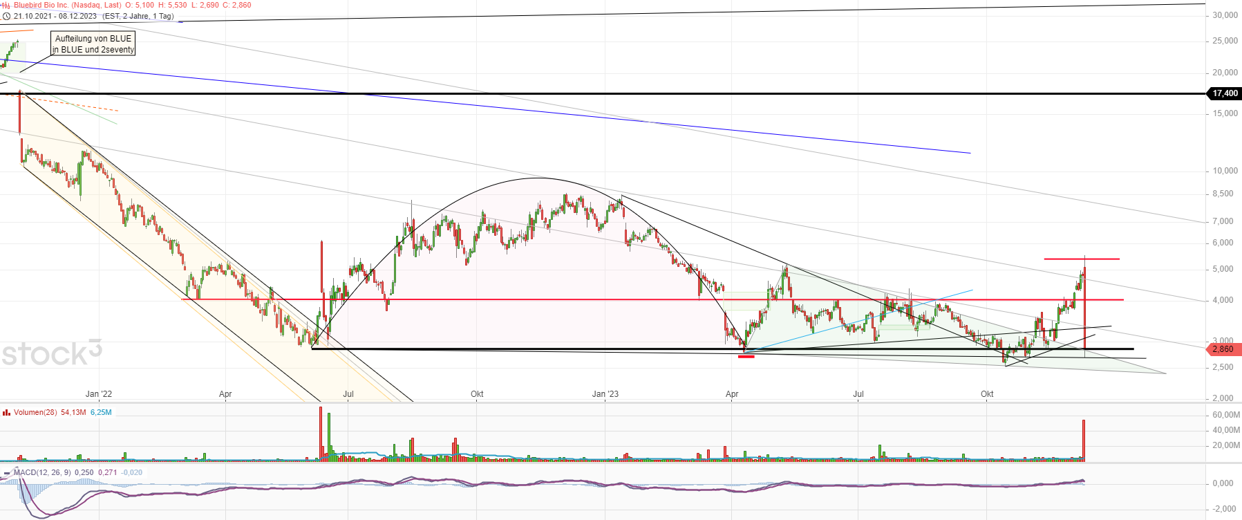 BLUE 2.86$ (-41%) Die Zulassung wurde heute erteilt, siehe Posting #406. Der Preis der Behandlung­ liegt bei 3,1 Mio.$. CRSP macht es für 2,2 Mio. $ und hat im Gegensatz zu BLUE ohne Blackbox Warnung.