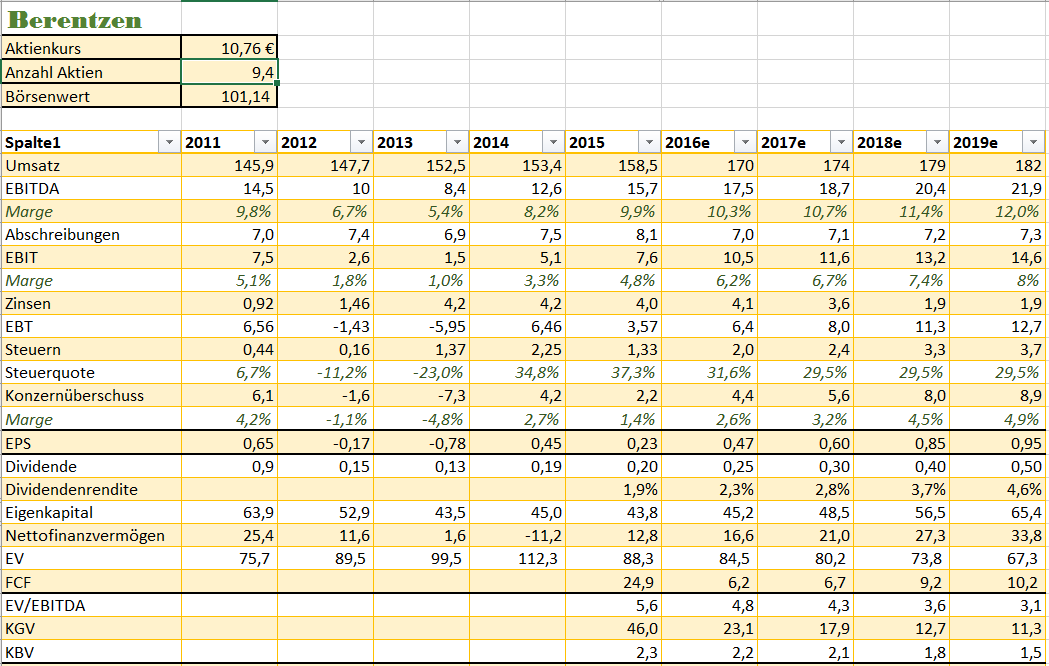 Habe meine Tabelle mal etwas aktualisiert. Mit Blick auf 2018 bleibt Berentzen ein klarer Kauf. Mein Kursziel ist weiterhin 20€. Wobei ich bei meinen Schätzungen eher konservativ vorgegangen bin. Schübel geht ja von einer EBIT-Steigerung von 2 Mio p.a. aus und, dass die mittelfristige Zielmarge von 8% schon 2018 erreicht werden kann. Ich lasse mich da lieber positiv überraschen und passe meine Schätzungen gegebenenfalls nach oben an.