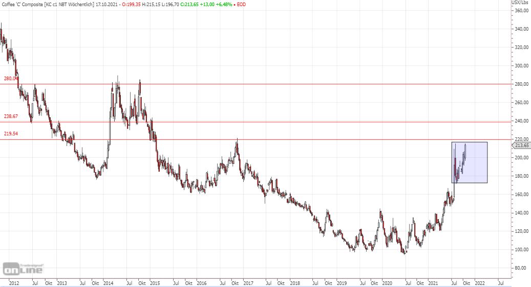 So lange der Preis nicht unter 220 fällt ist alles im Lot. Kaffee hat jetzt grob 3 Monate seitlich konsolidiert und und technisch sieht es eher nach einem weiteren Anstieg aus. Ziel ist jetzt der Bereich 275 Ende der Fahnenstange sollte aber wirklich der Bereich um 300 sein wo auch noch ein altes Hoch liegt. Selbst hätte ich es für sehr unwahrscheinlich gehalten, das der Kurs dann doch so stark ohne große drawdowns nach oben zieht.