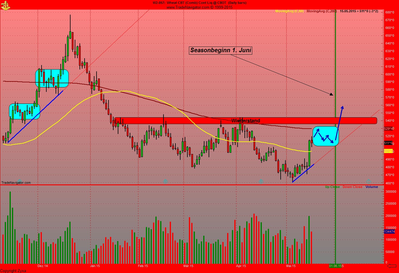 Ich denke, da der RSI bereits auf 60 gestiegen ist, haben wir nur noch wenig Luft nach oben auf 525-535. Wir werden sicher in den nächsten Wochen einen Rückfall im RSI auf 40-45 sehen, dann wären wir im Bereich von 490-475 beim Weizen und haben somit noch einmal die Möglichkeit eines Long-Einstieges, bevor es dann los geht.