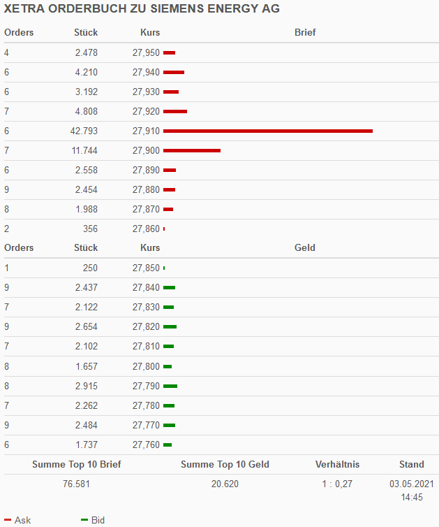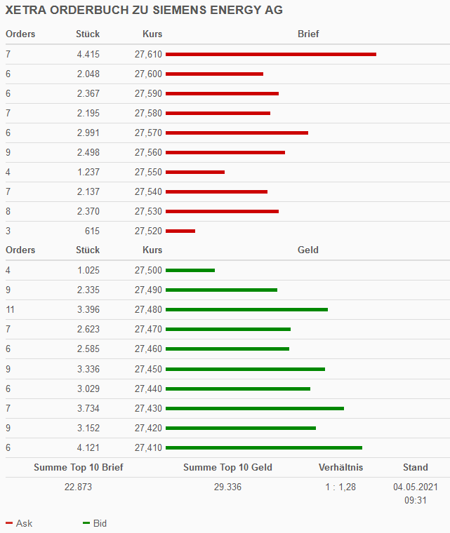 Ein DAX-Konzern, der vor Quartalszahlen ohne News um fast 5 % einbricht. Kurs 26,91 Euro... Ich bin ziemlich sprachlos. Die Überschrift "Analysten sehen Potenzial bei Siemens Energy-Aktie" von vor ein paar Tagen klingt da fast schon zynisch (https://www.finanzen.net/nachricht/aktien/...-energy-aktie-10083339).