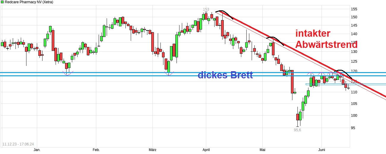 Wohin es langfristig geht kann keiner sagen. Aber gegenwärtig ist Norden ziemlich zugemauert, wenn man sich anschaut wie oft man zuletzt am Widerstand um 118/119 immer wieder abgeprallt ist. Auch der Abwärtstrend der letzten Monate ist weiter intakt. Von daher auch möglich es geht kurzzeitig süd-östlich weiter. Ob es eventuell auch mit dem anstehenden großen Verfallstag zu tun haben könnte den Kurs nach unten weiter zu drücken, wird sich ja im Anschluß an diesen Termin zeigen. Mit neuen Käufen würde ich vorerst abwarten bis derartige Marken überwunden werden und dann auch die Trader wieder mit ins Boot steigen.