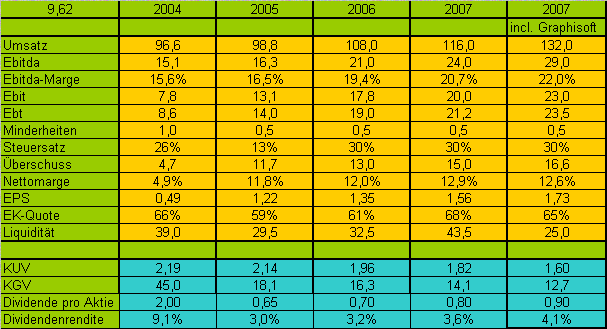 Graphisoft wächst noch deutlich dynamischer. Derzeit im Umsatz um 25-30% und im Überschuss noch stärker. Hier ist zu beachten, dass es Einmalbelastungen in 2006 gab, die für 2007 entfallen. Des weiteren gab`s noch nen Verlust aus nicht-fortgeführten Geschäften, dafür aber auch 1 Mio. Währungsgewinne, die nicht fortgeschrieben werden sollten.