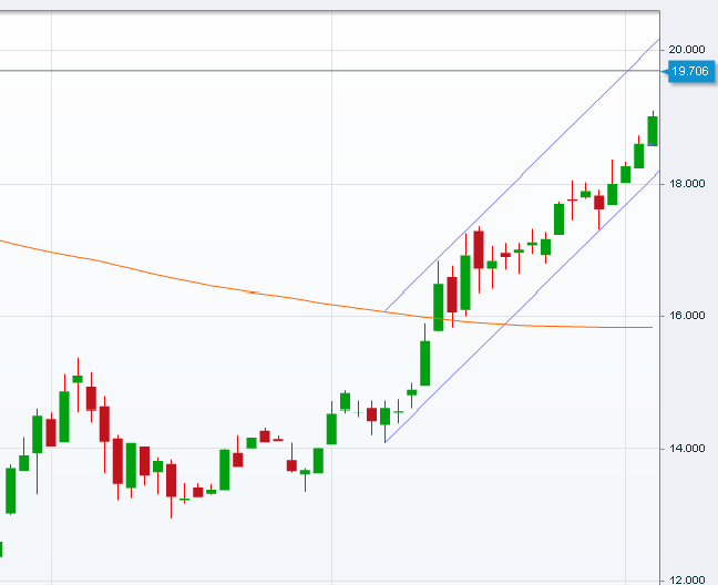 Im heutigen Rücksetzer ist der Kurs an der Trendkanalunterseite bei 18,34 abgeprallt. Der Aufwärtstrend ist weiterhin intakt. Der nächste Widerstand kommt bei 19,7 was dem Hoch von Ende Juli 2011 gleichkommt. Ich erwarte, dass wir noch diese Woche den Widerstand testen.