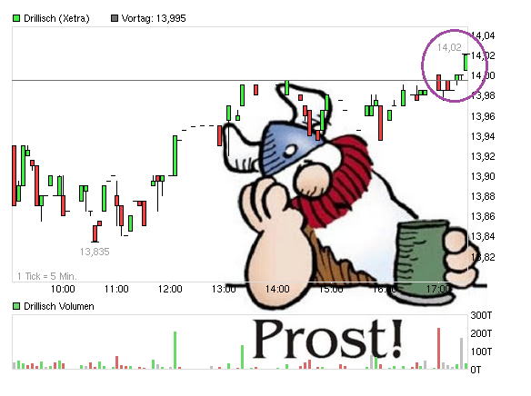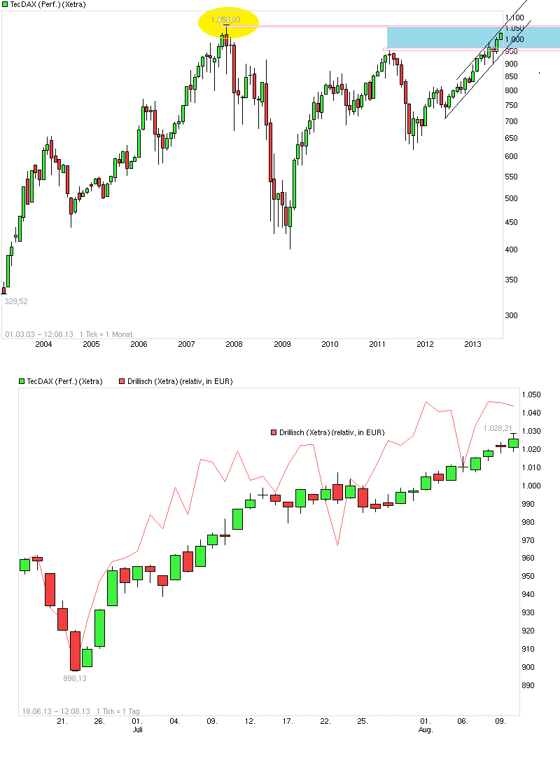 Der "Nebenkriegsschausplatz" TecDax auch heute stärker als der große DAX. Wieder ein neues Mehrjahreshoch. Es sind jetzt keine 3% mehr bis zum alten Allzeithoch bei 1058 Punkten. Mal schauen, ob der TecDax es dem DAX gleichmacht und auch das Jahr 2013 nutzt für neue Höchststände. Wäre für DRI eigentlich nicht schlecht, da man doch die letzten beiden Monate relativ nahe um den Index pendelte.