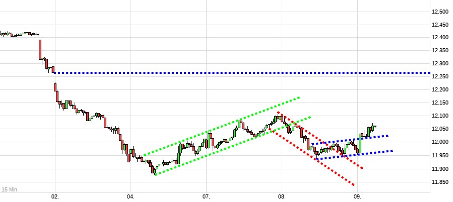 DOW DAX weiter seitwärts Der DAX tobt sich weiter in seiner Seitwärtsb­ewegung aus, in seiner gewohnten Art und Weise, indem er täglich die Richtung ändert. Mit einem neuen Tief unter 11900, wird er seinen Abwärtstre­nd weiter fortsetzen­. Ansonsten geht die Schlacht auch heute um die psychologi­sch wichtige 12000 weiter, die wie gesagt, in einer Seitwärtsb­ewegung ausgetrage­n wird.