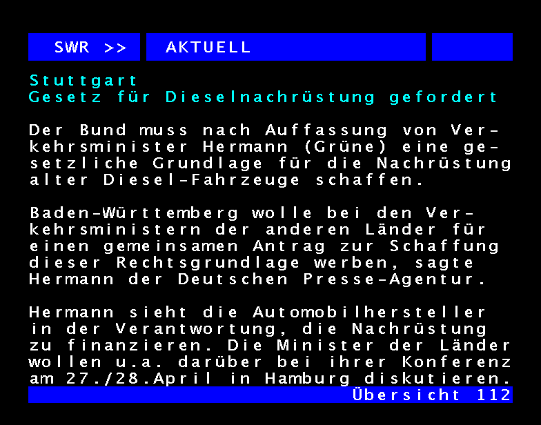 "Derweil führt das baden-württembergische Verkehrsministerium Gespräche mit der Autoindustrie darüber, ob Euro-5-Dieselfahrzeuge entgegen bisheriger Verlautbarungen nicht doch so nachgerüstet werden können, dass sie von den ab 2018 geplanten Fahrverboten für alte Diesel befreit werden könnten."
