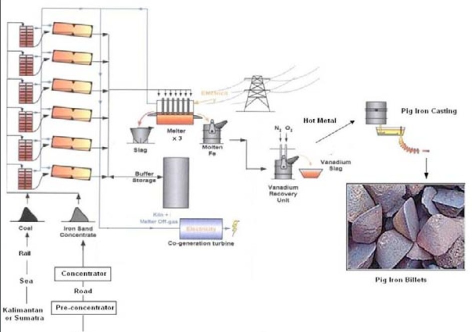 70% - 75% des Eisenerzes als Produkt gewonnen werden können. Danach wird der konzentrierte iron sand mit der Kohle aus Kalimantan und weiteren Aufschlägen (Kalk) zur Reduktion in die Drehrohröfen eingebracht und dort zu pig iron gesintert. Danach wird die Vanadiumschlacke ausgefällt. (Dieser Schritt erscheint nicht ganz plausibel, denn bei dem Reduktionsverfahren (DRI) wird mit Temperaturen weit unter dem Schmelzpunkt von Eisen gearbeitet, wie die Vanadiumschlacke ausgefällt wird ist aus der schematischen Darstellung nicht zu erkennen). Das bei dem Prozess entstehende Gas (Gicht) wird gereinigt und zur Energieerzeugung genutzt. Auch die Schlacken die aus dem Verfahren entstehen könnten genutzt werden, was auch zum Teil geschehen könnte, aber in diesem Projekt wird damit wahrscheinlich die im Minenbetrieb entnommene Mächtigkeit wieder verfüllt, um den Umweltauflagen gerecht zu werden. Wenn das dafür nötige Material von anderer Stelle über lange Transportwege herangeschafft werden müsste wäre die Wirtschaftlichkeit des Schlackenverkaufs in Frage gestellt.