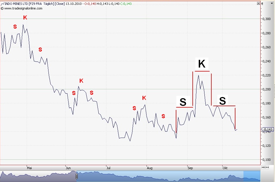 In der Wochenansicht ist eine Formation wie hier, über beinahe 2Monate, schwer zu erkennen. Grundsätzlich gilt die SKS in allen Zeitansichten, in der Wochenansicht oder auch im Daytrading gilt die sie genauso wie im Jahreschart oder 10 Jahreschart. Am leichtesten läßt sich die SKS im Linienchart erkennen, deshalb wurde der auch benutzt.