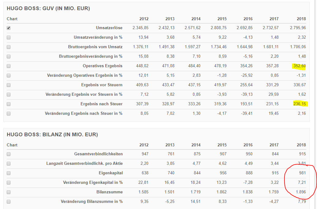 Das einzige was einen an der Vergangenheit interessieren könnte wäre der Verlauf aller Daten. Und genau dieser sieht bei Hugo Boss schlecht aus. Eher negative Entwicklung.