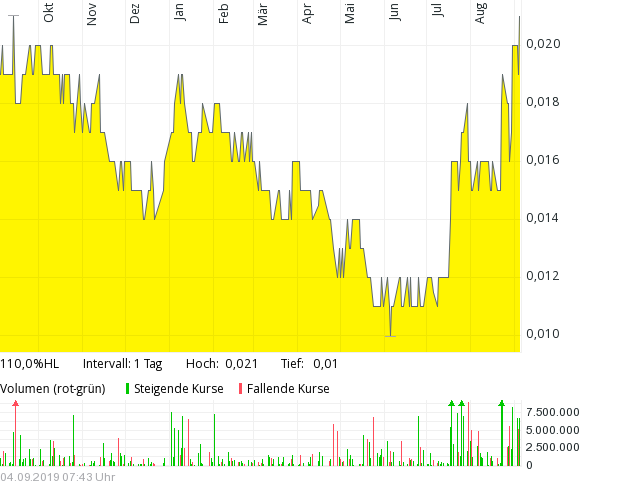 momentan geht es erst mal wieder leicht nach Süden mit dem Kurs. Es müsste zeitnah noch eine sehr gute News folgen, damit der Kurs nicht erst wieder verwässert um mal wieder die 0,02 AUD Cent zu knacken.