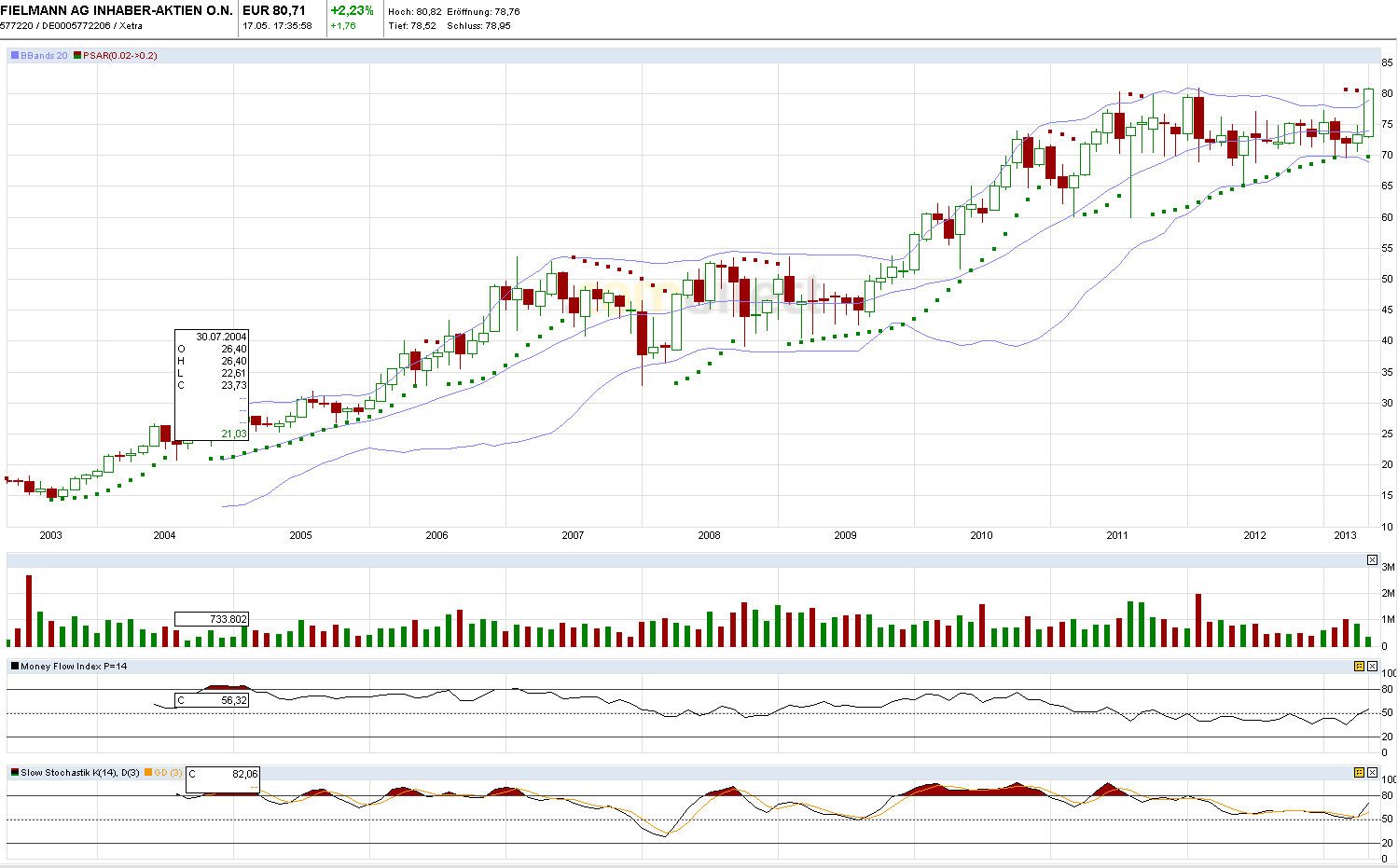 Fielmann im Monats Chart Hab Fielmann schon länger auf meiner Watchlist,­ da die Bollinger Bänder im Monatschar­t stark verengt sind. Nun dürfte die lange Seitwärtsp­hase vorbei sein und eine dynamische­ Aufwärtsbe­wegung starten können.