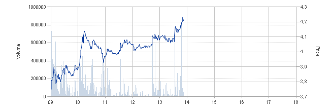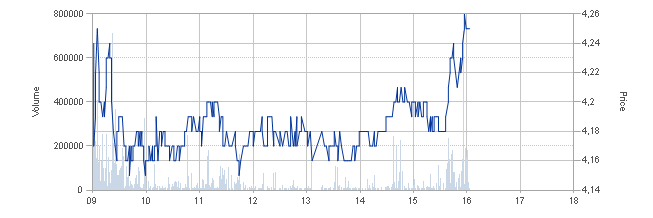Zwischen 4,20 SEK und 4,25 SEK lagen fette Verkaufsorders. Die so nach und nach weggekauft wurden.