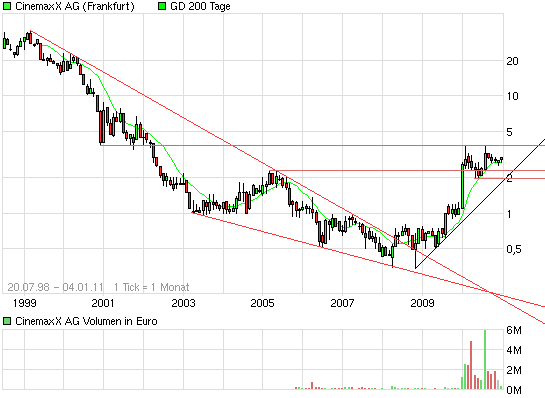 Da es auch Kinos von Cinemaxx gab, die besser abgeschnitten haben, kann man wohl mit einem Besucherrückgang von 4 - 5% in 2010 rechnen. Umsatz dürfte daher knapp um 10% gestiegen sein. In Anbetracht eines Gesamtrückgangs von 17% hat Cinemaxx wirklich erheblich Marktanteile gewonnen. Ich glaube im übrigen nicht dass die Konkurrenz stark mit 3 D aufrüsten kann in 2011, da sie es sich schlicht nicht leisten können nach so einem Jahr. Der größte 3 D Profiteur im deutschen Kinomarkt ist und bleibt Cinemaxx, jetzt muss es nur noch die Börse begreifen:-)