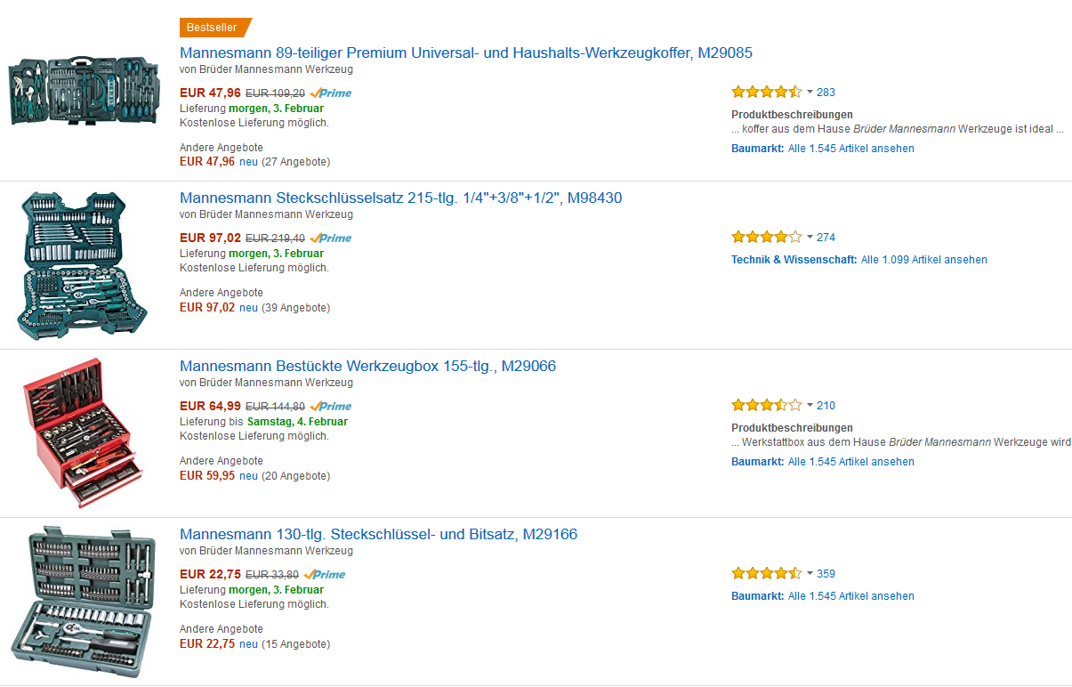 Das Werkzeug erreicht in zahlreichen aktuellen Werkzeugtest Topplatzierungen und scheint auch sich auch sehr gut zu verkaufen. Man braucht nur in "Google" , "Amazon" oder Ebay den Begriff "Brüder Mannesmann Werkzeug" einzugeben und wird erstaunt sein,wie viele Treffer angezeigt werden und wie breit die Aufstellung der Marke ist. Ein deutliches Indiz dafür,dass die Nachfrage für die Produkte sehr groß ist und es sich sehr gut verkauft. Denn sonst würde kein Händler sich die Mühe der Aufnahme in seine Angebote machen