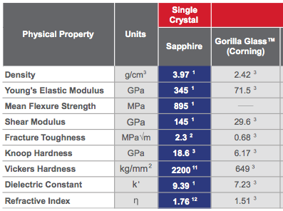 ....In regard to the other mechanical properties listed, sapphire seems to have a significant advantage. For example, sapphire has approximately three-fold greater hardness when compared to Gorilla Glass ....