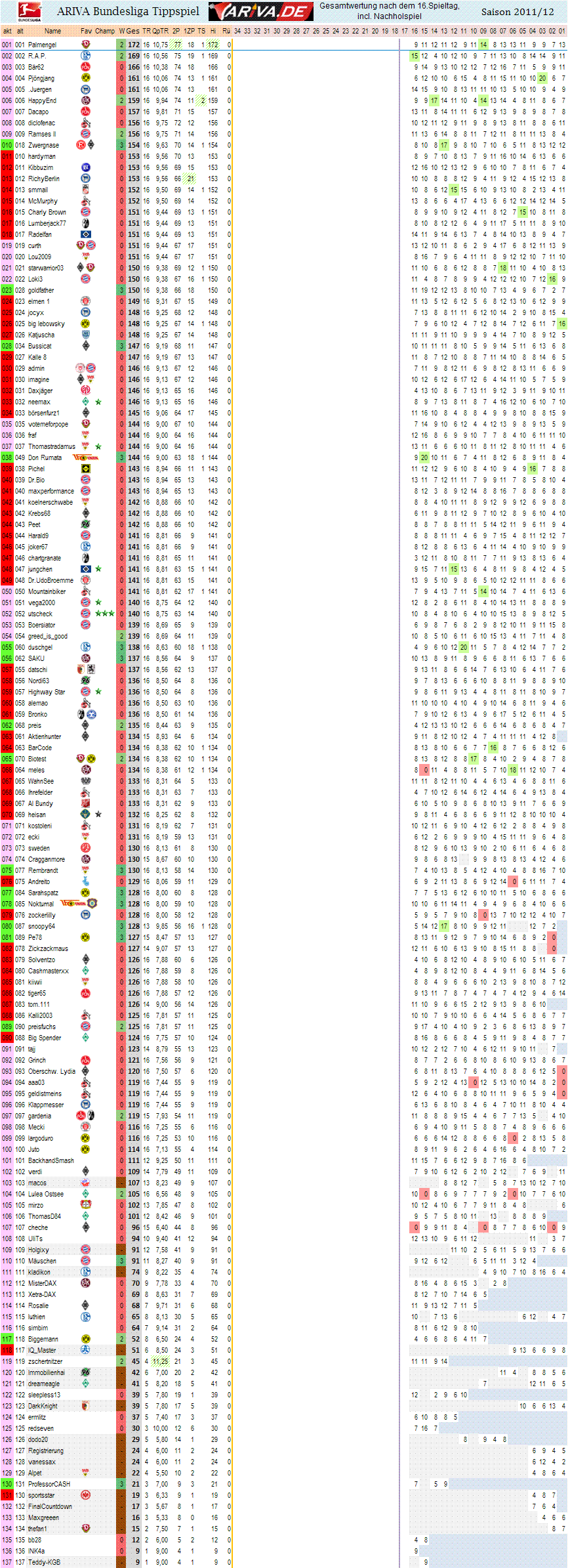Und zschertnitzer, der an jenem Spieltag neu hinzukam zum Tippspiel kassiert auch gleich nochmal Punkte, so das da nun die beste Quote p. Tippabgabe "funkelt".. Zwar erst 4x mitgetippt, aber Schnitt von 11,25..