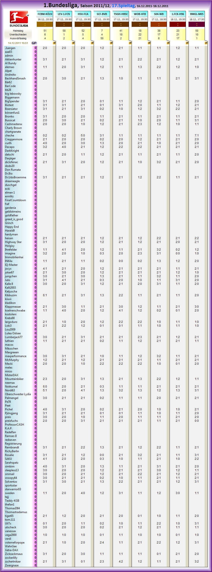 Hier findet man die komplette Tagessiegerwertung des 13.Spieltages...