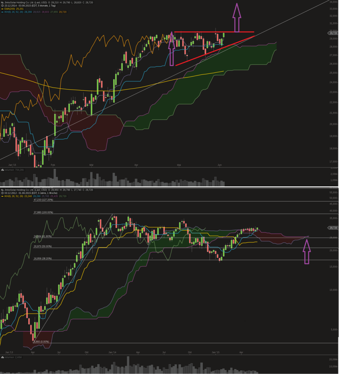 Variante 1 war, dass die Aktie zumindest bis in den Bereich von 25USD läuft, um zumindest bis auf die Marke von auf 61,8% des Anstieges seit Januar im Fibo-Level zu korriergieren! Die 200-Tage Linie verläuft nun einen Monat später zwar etwas höher bei 26USD, jedoch wird diese allein bei einer Korrektur im Falle Jinko nahezu keinerlei Unterstützung bieten, so dass wir mind. bis 25USD (...besser wäre sogar 23USD) durchlaufen "würden". Die 200-Tage-Linie mag als Orientierung und Indikator eines Trends gut sein, jeodch sieht man, dass sie beim Kursverlauf der Jinko schon seit 2013, weder große Bedeutung als Widerstand noch als Unterstützung hat.