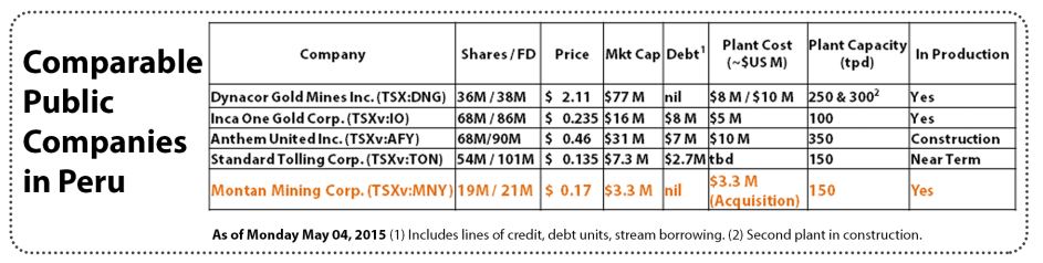 Montan Mining (TSXv: MNY) is Peru’s newest toll milling company. The company has an agreement to buy an already gold-producing 150 tpd plant. Unlike its rivals in Peru, this company will have the capacity to process copper as well.