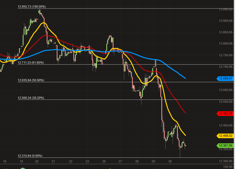Wieweit könnte die DAXerholung gehen im Juli? Das Ziel kann nur lauten 12560, wenn ich die Strecke messe von 12955 bis 12315 ist das 38,2 Erholungsretrace bei 12560, dem Tief vom 28.06.2017 etwa. Deshalb am Freitag long positioniert mit Ziel 12560.