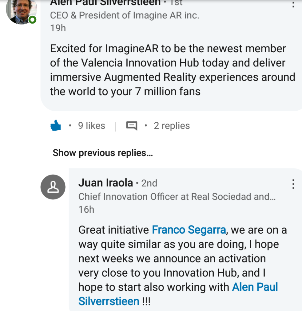 biggest soccer clubs in the world to provide its Augmented Reality Platform for fan activation and engagement in addition to signing a 5-year agreement with the NFL Alumni Association Academy to provide its Augmented Reality Platform for the launch of their new NFLA mobile interactive products. This agreement provides for equal program revenue sharing over the 5-year term. They also have a fairly solid list of clients and collaborations https://imaginear.com/clients that they are building upon. ImagineAR also has a portfolio of 5 issued patents that covers multiple new and