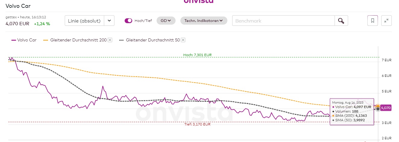 In den kommenden Tagen/Wochen wird sich das Schicksal von Volvo-Car zumindest am Kurszettel so oder so entscheiden. Wir stehen quasi am Schnittpunkt von realem Kurs, 50-Tage- und 200-Tage-Linie. Geht es jetzt erneut abwärts, dann ist die Geschichte ursmäßig eh gegessen.