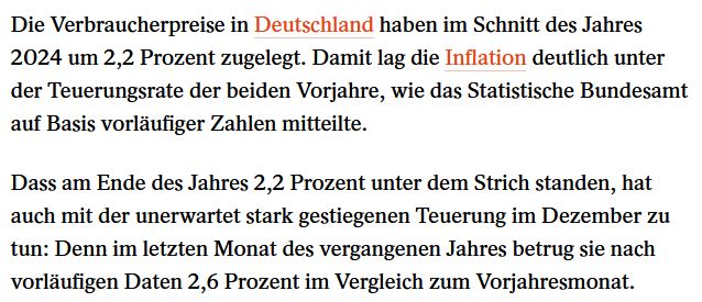 Hier eine Expertenstimme zu den deutschen Verbraucherpreisdaten: "Der lange Weg der Inflationsentspannung endet mit Pauken und Trompeten", sagte Alexander Krüger, Chefvolkswirt der Hauck Aufhäuser Lampe Privatbank, zu ntv.de: "Von hier aus werden die Inflationsweichen jetzt neu gestellt. Risiken von der Lohn- und Energieseite liegen weiter auf dem Tisch. Die Inflationsrate wird in den nächsten Monaten daher wohl eher einen Touch über als unter 2,0 Prozent liegen. Mindestens aber zeichnet sich eine Phase mit Quasi-Preisstabilität ab. Die deutsche Vorgabe schiebt die EZB über September hinaus zu Zinssenkungen."